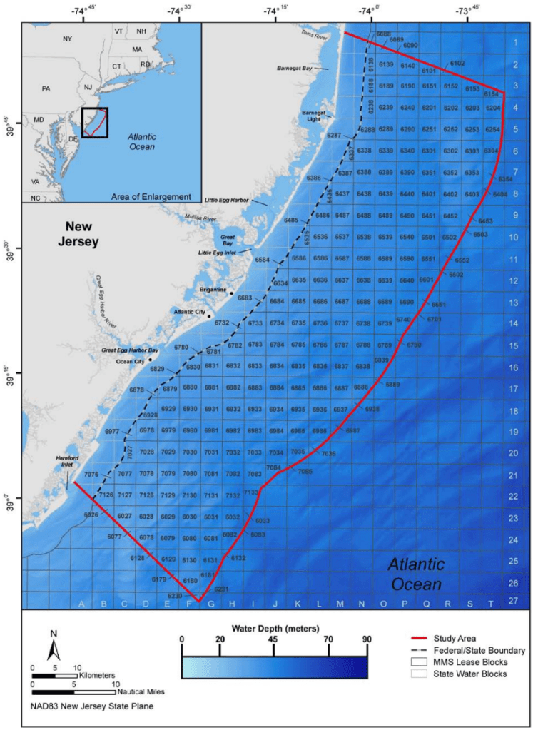 Between 2008 and 2009, the NJDEP’s Office of Science conducted a study to obtain data on ecological resources in the Atlantic Ocean offshore New Jersey. The scope of work included data on the distribution, abundance and migratory patterns of avian, marine mammal, sea turtle and other species in the study area. The study area extends roughly 72 nautical miles from Seaside to Stone Harbor, beginning at the shoreline and extending out 20 nautical miles seaward (see map below).